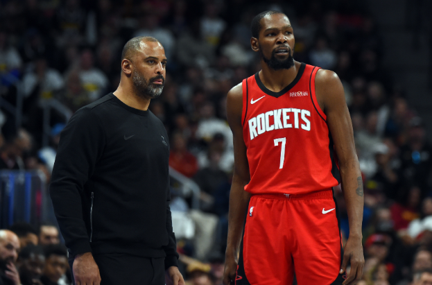 但为什么本赛季火箭阵地战进攻始终有一种“滞涩感”?范弗里特受伤是一个方面,火箭没有,或者说无法给杜兰特足够的空间支援去发挥牵制力是一方面。杜兰特持球遭遇了大量包夹,特别是关键时刻,这限制了其产量。当杜兰特把球分出,球很难再回到他手里,队友终结能力也不足。杜兰特打无球时乌度卡设计的战术太少,全队缺少跑动、接应,之前乌度卡自己也聊过这个问题。